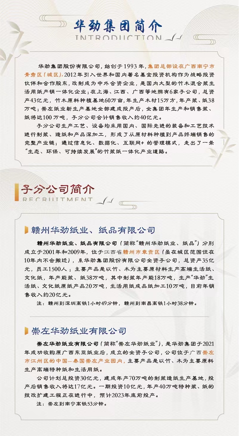 | 单位介绍 | 一、公司简介 (一)华劲集团简介 华劲集团股份有限公司,始创于1993年,集团总部设在广西南宁市青秀区(城区),2012年引入世界和国内著名基金投资机构作为战略投资伙伴和合作股东,改制成为中外合资企业,是国内大型的竹木混合浆生活用纸产销一体化企业;在上海、江西、广西等地拥有6家子公司,总资产43亿元,竹木原料种植基地60万亩,年生产木材15万方,年产浆、纸38万吨;崇左纸业新生产基地全部建成投产后,全集团年生产和销售浆、纸将达100万吨,子分公司合计销售收入约40亿元。 子分公司生产工艺、设备均采用国内、国际先进的装备和工艺技术进行制浆、造纸和产品深加工,形成了从原材料种植到产品终端销售的完整产业链;通过信息化、数据化、互联网+的管理模式,走出了一条 “生态、环保、可持续发展”的竹浆纸一体化产业道路。 (二)赣州华劲纸业、纸品简介 赣州华劲纸业、纸品有限公司(简称“赣州华劲纸业、纸品”)分别成立于2001年和2009年,位于江西省赣州市章贡区(虽在城区范围但在10年内不会搬迁),系华劲集团股份有限公司全资子公司,总资产35亿元,员工1500人;主要产品是以竹、木为主要原材料生产高端生活纸、文化纸,年产能浆、纸38万吨,其中制浆年产能18万吨,生产“华劲”生活纸、文化纸原纸产品20万吨,生活用纸成品纸加工10万吨,目前年销售收入约20亿元。 注:赣州到深圳高铁1小时49分,赣州到南昌高铁1小时38分钟。 (三)崇左华劲纸业简介 崇左华劲纸业有限公司(简称“崇左华劲纸业”),是华劲集团于2021年成功收购原广西东亚纸业后,成立的全资子公司,公司位于广西崇左市江州区的中国-泰国崇左产业园内,主要产品是以竹、木为主要原料生产高端特种纸和生活用纸。 公司计划总投资30亿元,建成年产70万吨的制浆造纸生产基地,投产后销售收入将达17亿元。一期投资10亿元,年产40万吨特种浆、纸的技改扩建工程正在进行中,预计2023年底前投产。 注:崇左到南宁高铁53分钟。 |