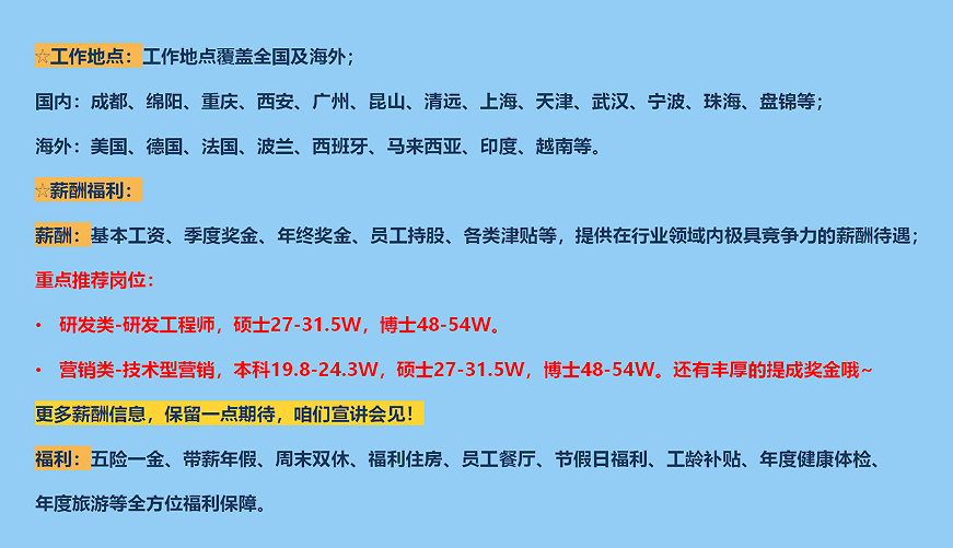 2、福利住房(注:本科两人间、硕士单人间、博士两房一厅,后续按公司政策升级更高的住房标准),员工户口档案接收,配车激励,员工持股计划,子女入学安置,优质餐饮为员工提供无忧保障;