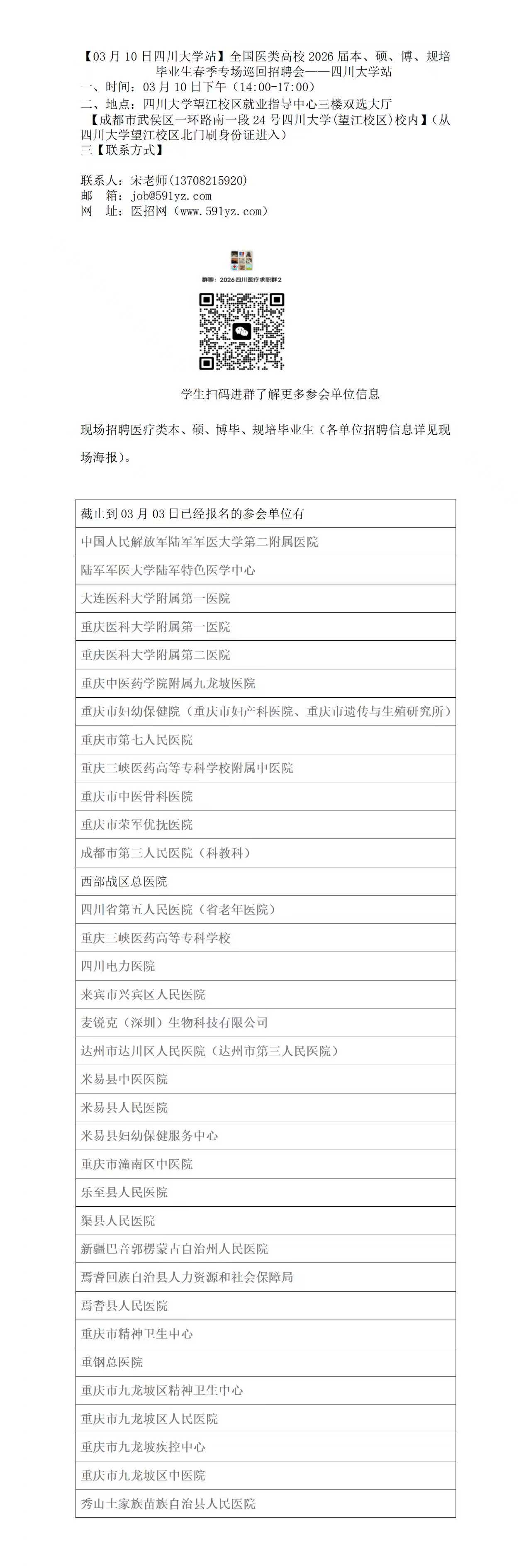 【03月10日四川大学站】全国医类高校2026届本、硕、博、规培毕业生春季专场巡回招聘会——四川大学站