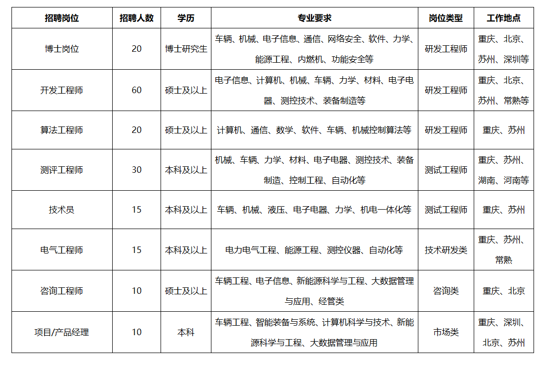 投递邮箱:hrm_zp@caeri.com.cn(邮件主题:中国汽研+学校+学历+工作地点+专业)