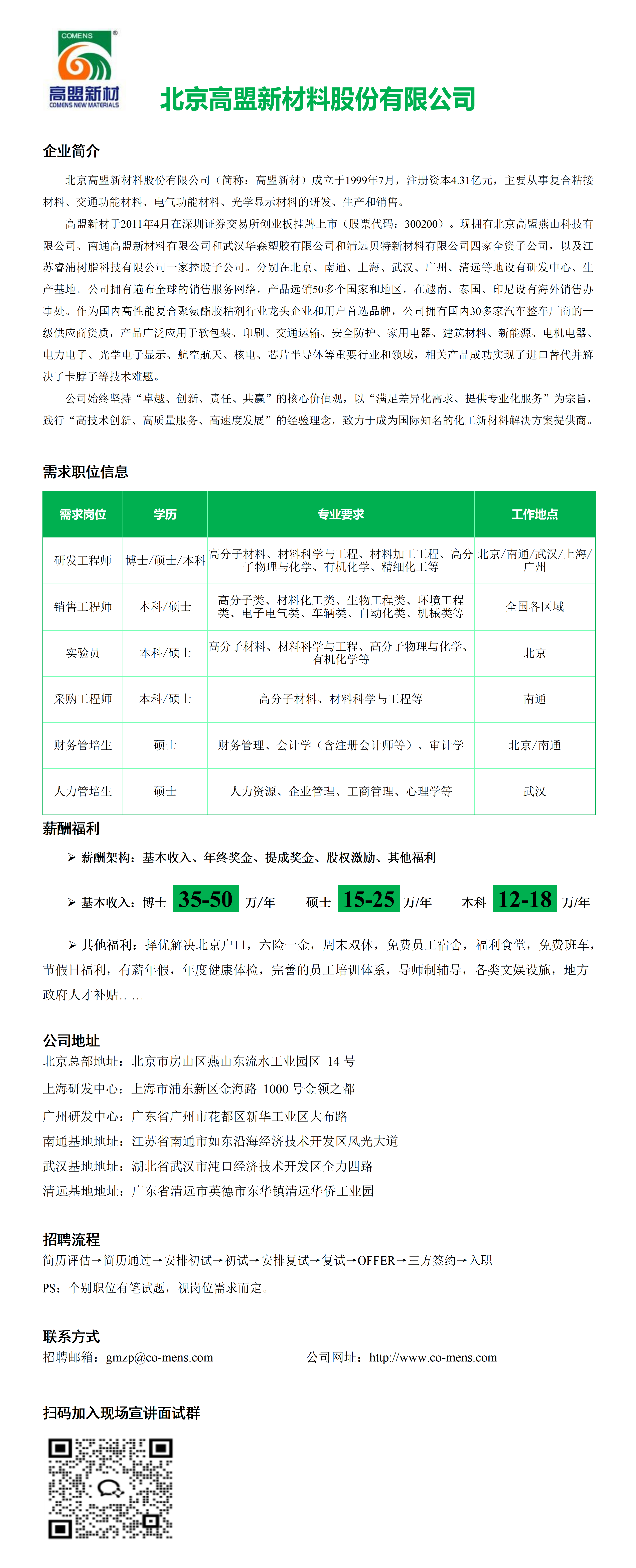 | 单位简介 | 北京高盟新材料股份有限公司(简称:高盟新材)成立于1999年7月,注册资本4.31亿元,主要从事复合胶粘材料、功能交通材料、新型能源材料、低碳涂层材料、光电显示材料的研发、生产和销售。 高盟新材于2011年4月在深圳证券交易所创业板挂牌上市(股票代码:300200)。现拥有北京高盟、南通高盟、武汉华森、清远贝特四家全资子公司,以及江苏睿浦一家控股子公司。高盟新材拥有北京、上海、南通、武汉、广州五大研发中心,北京、南通、武汉、清远四大生产基地,以及遍布全国主要区域城市的销售服务网络。公司拥有外贸经营出口权,产品出口到50多个国家和地区。 高盟新材是国内高性能复合聚氨酯胶粘剂行业龙头企业和用户首选品牌,全资子公司武汉华森塑是隔音减振降噪材料的专业生产厂家,目前拥有国内30多家汽车整车厂商的一级供应商资质。全资子公司清远贝特主要从事绝缘树脂、电子胶、特种涂料的研发、生产和销售,在该领域产品的技术处于国内领先水平。高盟新材产品广泛应用于包装、印刷、交通运输、安全防护、家用电器、建筑材料、新型能源、电力电子、光学电子显示等新兴行业和重要领域,相关产品成功解决了国外进口替代和卡脖子技术难题。 | 企业文化