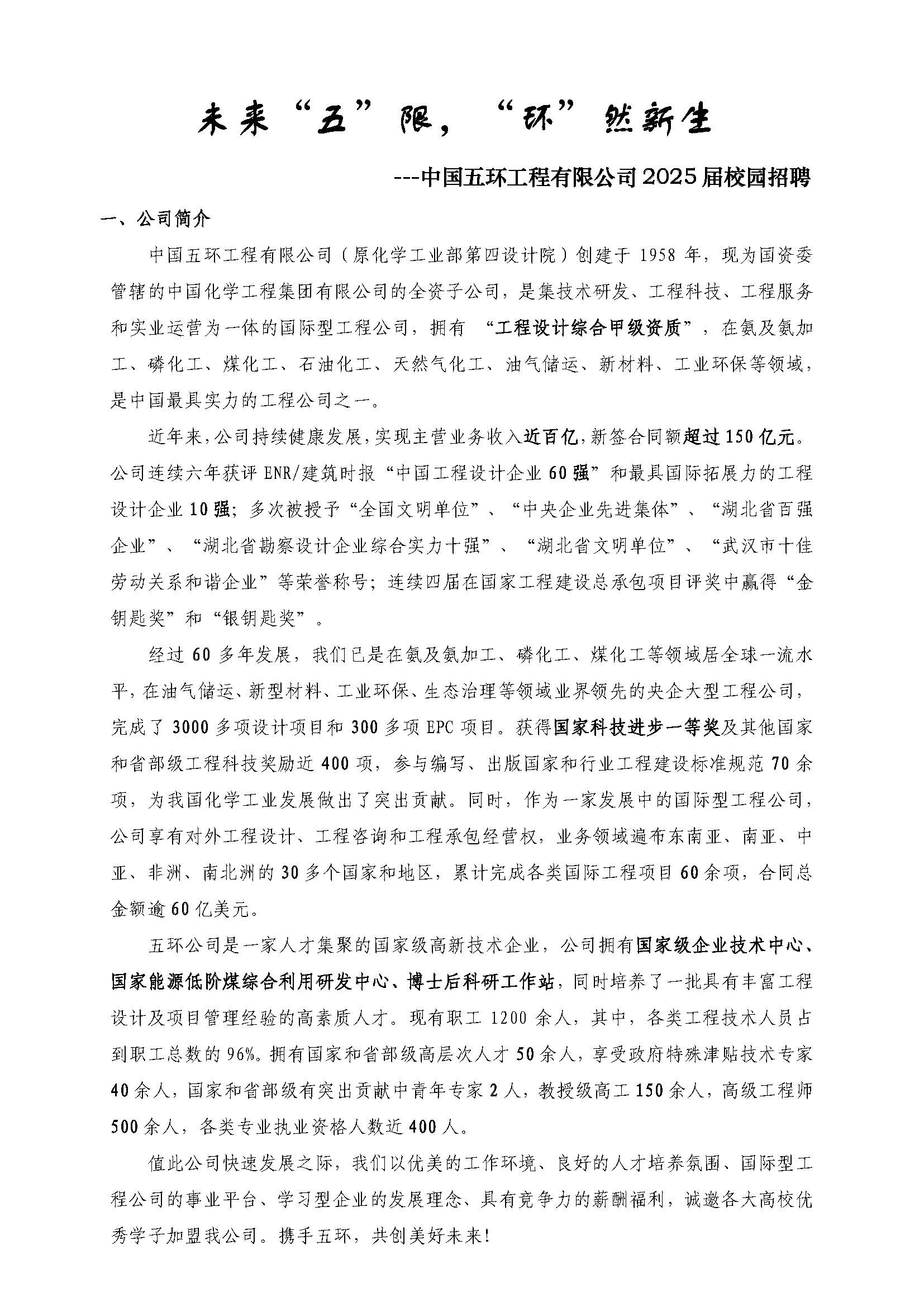 未来“五”限,“环”然新生 ---中国五环工程有限公司2025届校园招聘