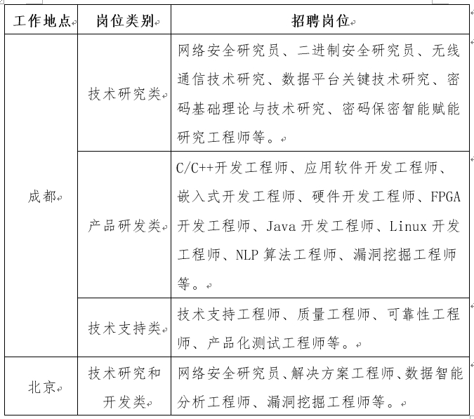 需求专业为:网络安全类、数学类、密码学类、计算机科学与技术类、信息与通信工程类、电子与信息类、控制科学与工程类、软件工程类、仪器科学与技术类、机械设计与制造类等。