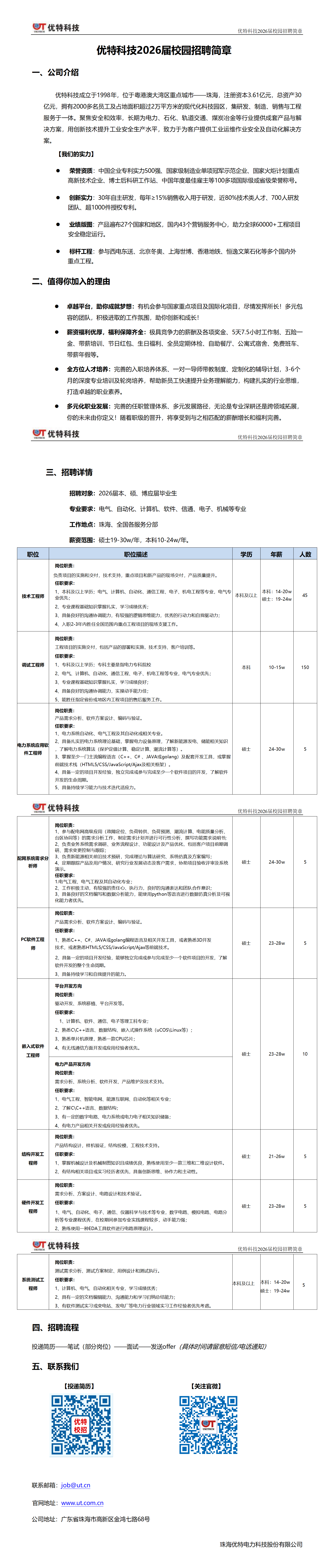 单位介绍 | 一、 公司介绍 优特科技成立于1998年 ,位于粤港澳大湾区重点城市——珠海,注册资本3.61亿元,总资产30亿元,拥有2000多名员工及占地面积超过2万平方米的现代化科技园区,集研发、制造、销售与工程服务于一体。聚焦安全和效率,长期为电力、石化、轨道交通、煤炭冶金等行业提供成套产品与解决方案,用创新技术提升工业安全生产水平,致力于为工业企业提供全球领先的作业安全过程联锁及智能化产品。 荣誉:国家级制造业单项冠军示范企业、国家火炬计划重点高新技术企业、国家知识产权示范企业、国家火炬计划软件产业基地骨干企业、国家规划布局内重点软件企业、博士后科研工作站等。2015年获得市长质量奖、2017年获得广东省政府质量奖。。 业绩:核心产品市场占有率近 50%,产品遍布26 个国家和地区,国内42个营销服务中心,助力全球 60000+工程项目安全稳定运行。并成功应用于奥运保电、 三峡工程、世博会变电站、西电东送等多项国家重点项目中。 实力:拥有员工 2000 多名,技术人员占比 78%;注册资本3.61亿万元,总资产30亿元,6 万平方米的现代化科技园;超1000 件有效授权专利,3 项国际领先,5 项 国际先进,5 项国内领先。 发展:公司一直保持不低于销售收入的 10%作为研发投入,用于产品创新及人才 培养,近 5 年研发投入比例约 17%;无论国际环境及国内市场如何风云变化,公司业绩始终保持稳定持续增长。 品牌理念:公司使命——用安全和智慧构建美好生活 公司愿景:做智能安全技术的引领者 核心价值观:客户第一、团队合作、持续创新、开放进取、勇于担当、正直阳光 人才理念: 选人:道相同,能干事,敢担当,善协作,够坚韧; 育人:持续学习,学以致用;打造学习型组织; 用人:人事相宜,科学激励;给年轻人更多机会。 二、公司福利 1.业内极具竞争力的薪酬,除此还有研发项目奖金、年终绩效奖金, 以及优秀团队或个人奖、创新奖、金点子奖、合理化建议奖等等,总价值超过四千万的奖励; 2.5险1金; 3.五天 7.5 小时工作制; 4.优越的地理位置,公司拥有独立园区,交通顺畅,生活便利; 5.明亮卫生的餐厅环境,可自助式选餐; 6.定期全员体检; 7.固定的员工文化活动经费; 8.公司组织的各项体育、休闲、文化、娱乐活动; 9.节日红包,高于法定标准的带薪假等。 三、工作地点 工作地点:广东省珠海市金鼎工业园金鸿七路 68 号-优特科技园