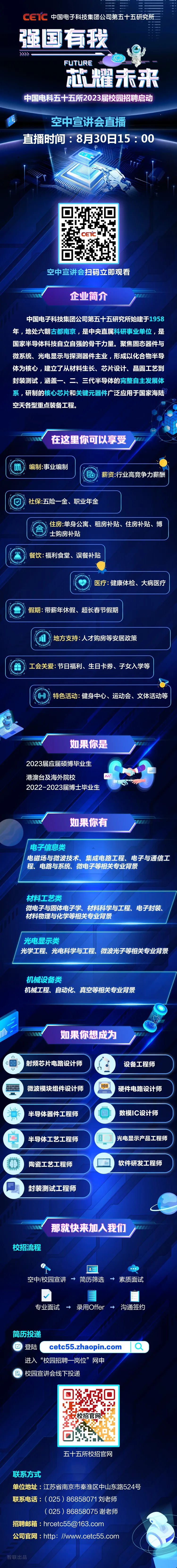 | 单位简介 | 中国电子科技集团公司第五十五研究所始建于1958年,地处六朝古都南京,是中央直属科研事业单位,是国家半导体科技自立自强的骨干力量。聚焦固态器件与微系统、光电显示与探测器件主业,形成以化合物半导体为核心,建立了从材料生长、芯片设计、晶圆工艺到封装测试,涵盖一、二、三代半导体的完整自主发展体系。研制的外延材料、射频微波芯片与器件、微波毫米波模块与组件、电力电子器件与模块、射频微波封装与外壳、射频MEMS与微系统、平板显示与紫外光电探测器件产品,广泛应用于国家海陆空天各型重点装备工程,以及5G移动通讯、新能源、微显示等国民经济建设领域。