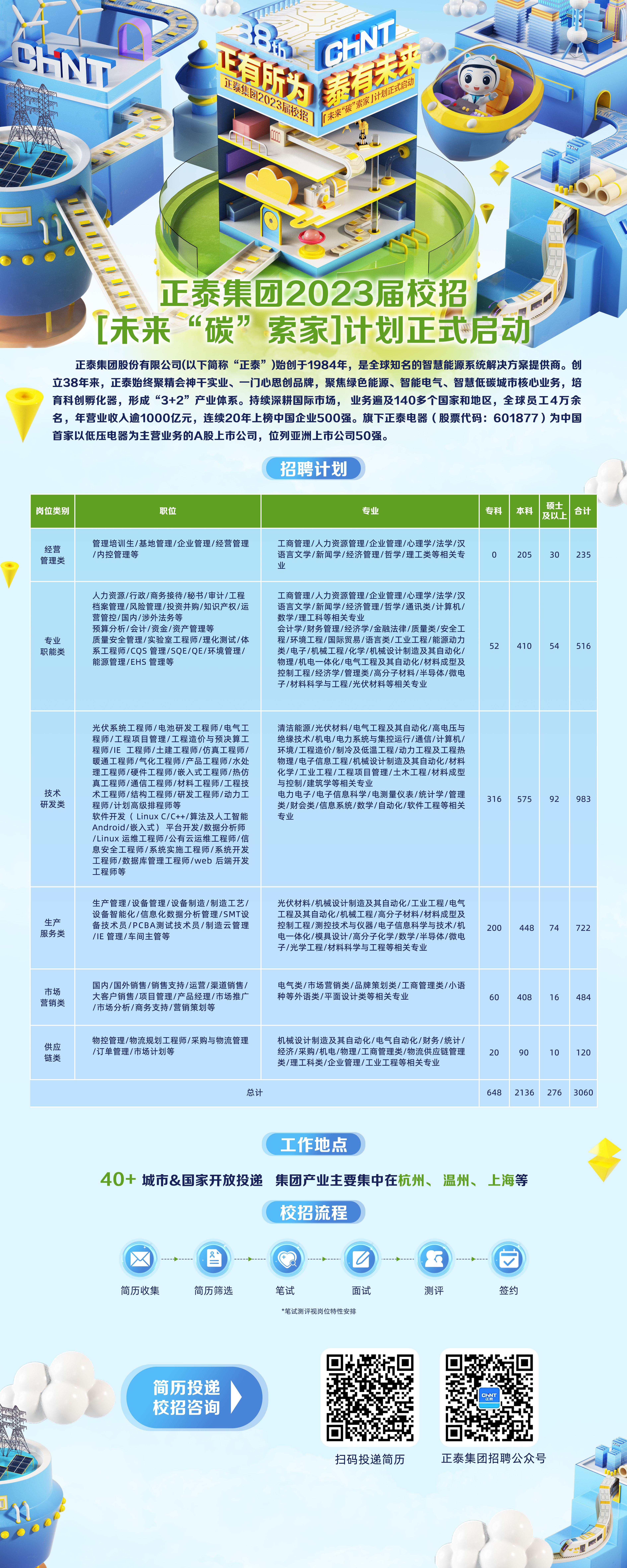 | 全方位培养 正泰集团全产业链优势, 为您提供多维度培养平台和机会。 通过“ 继任者计划” 建立人才梯队, 根据不同职类/层级的岗位要求及发展路径, 设置了以专业技能为纵向, 以管理技能/知识提升等为横向的矩阵培训模式,通过对管理与专业团队的培养,有效推进了“ 人与岗/全与专/青与壮” 的人才培养策略。 | | 考核方式 | | 见招聘简介 | | 其他说明 | | 无 |