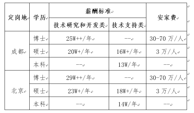 2.超强福利:安家费、精装单身公寓(成都)/租房补贴(北京)、工作餐补贴、通讯补贴、节假日补贴、出差补贴、防暑降温费、烤火费等;