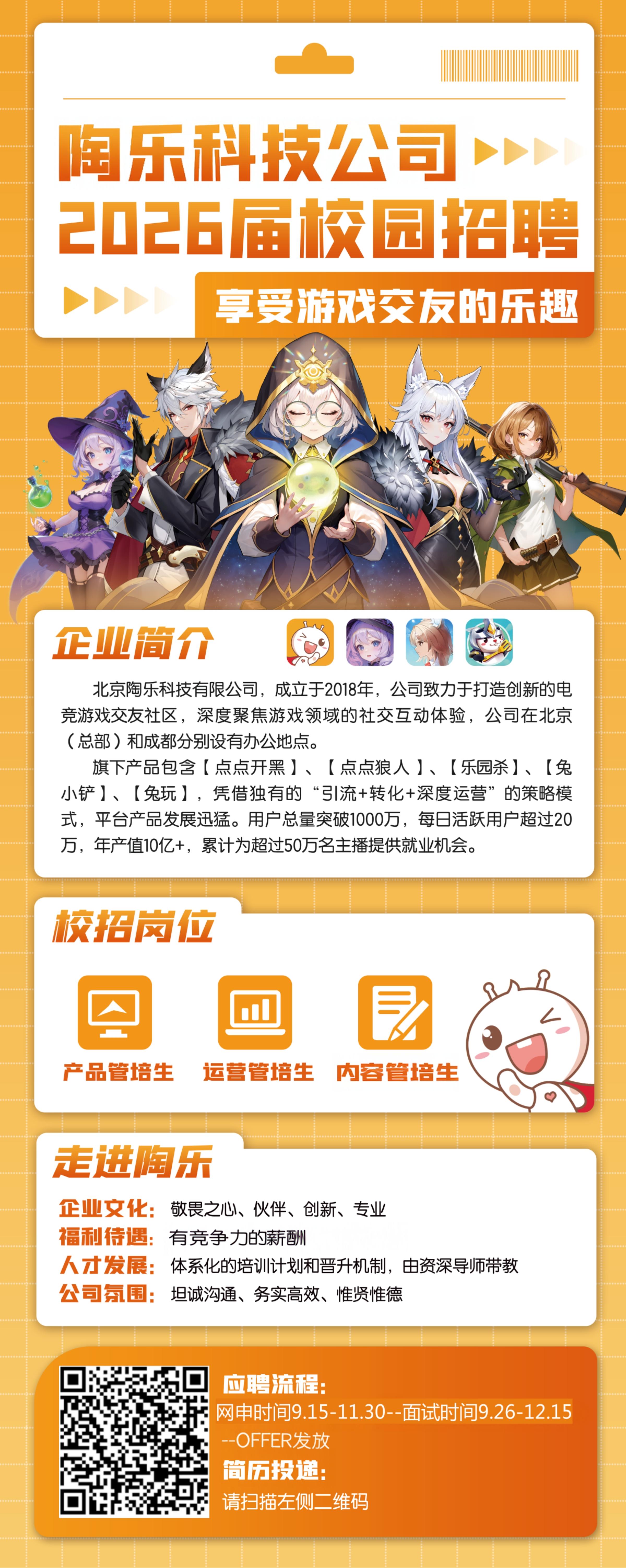 | 职位简介 | 公司信息: 一、关于我们 陶乐科技成立于2018年,致力于构建国内领先社交游戏研发和运营平台。用创新多人互动游戏和玩家自创游戏,让玩家体验游戏交友的乐趣。 公司旗下有运营的点点开黑、点点狼人、乐园杀产品,开发中的3D多人射击和音乐元宇宙项目。目前公司员工500多人,注册用户超过1000万,年营收过10亿RMB,并且每个月持续增长中。 为继续夯实我们在社交游戏研发、运营的基建和给玩家提供更好的用户体验和更多选择,我们将持续引进游戏行业经验丰富的资深人员,同时引进热爱游戏的高校毕业生,让热爱游戏的年轻人主导公司的未来。 二、我们的文化 敬畏之心、伙伴、专业、创新。陶乐人互为伙伴,相互成就,在不作恶的前提下,做精品和好玩的游戏。 三、公司发展历程 1)2018年,前身:兔玩,以英雄联盟为主的电竞媒体。随着自媒体兴起,兔玩开始尝试游戏开黑业务。 2)2019年,第一个免费开黑模式诞生,商业模式再创新,成为行业引领者。 3)2021年,自研游戏点点狼人成功上线,在一片火海中生存下来。 4)2023年,乐园杀派对游戏上线,公司产品研发能力再次升级。 简历可投递至邮箱:xiaoy3@tuwan.com | ||||