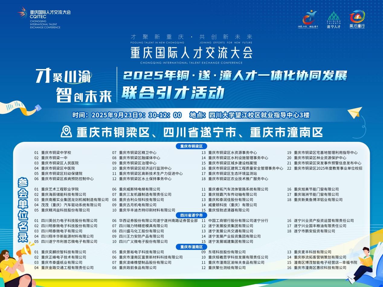 9月23日上午,重庆市铜梁区将会同四川省遂宁市、重庆市潼南区在四川大学望江校区开展重庆国际人才交流大会2025年铜•遂•潼人才一体化协同发展联合引才活动。