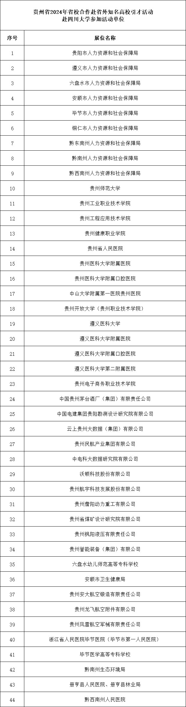 为深入学习贯彻党的二十大和二十届二中、三中全会精神,全面落实习近平总书记关于做好新时代人才工作的重要思想和视察贵州重要讲话精神,贯彻落实贵州省委十三届五次全会部署,坚持以高质量发展统揽全局,坚持人才引领发展的战略地位,着眼“六大产业基地”“富矿精开”“3533”重点产业集群等部署安排,贵州省人社厅组织9个市(州)人力资源社会保障局及50余家教育、医疗、大数据、航空等企事业单位于9月24日在四川大学开展专场招活动。
