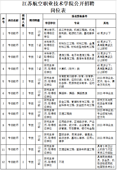咨询电话及联系人:江苏航空职业技术学院人事处,0511-87052750;简历投递专用邮箱:zzrsc@jatc.edu.cn(邮件主题请注明:所学专业+姓名+学历学位)。