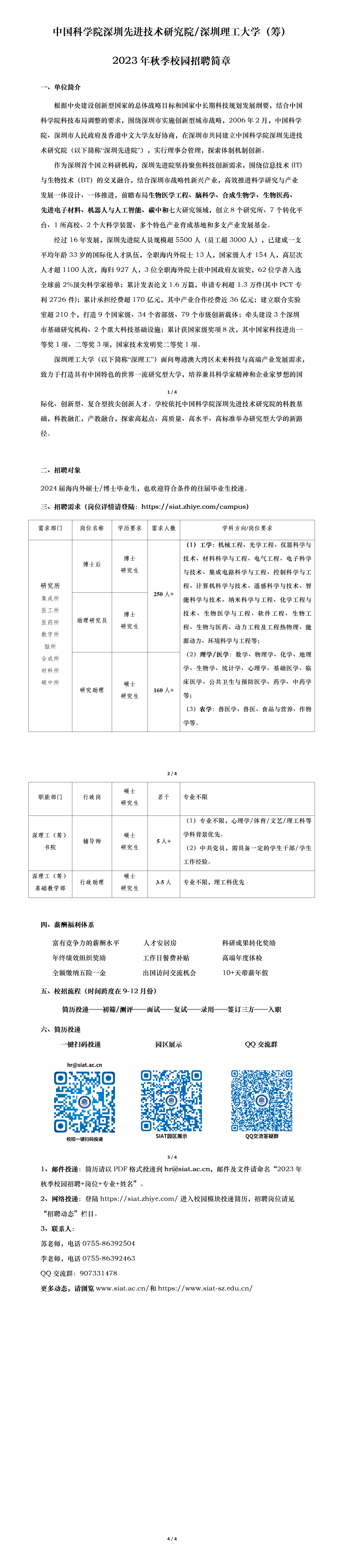 » 中国科学院深圳先进技术研究院/深圳理工大学(筹) 2023年秋季校园招聘简章
